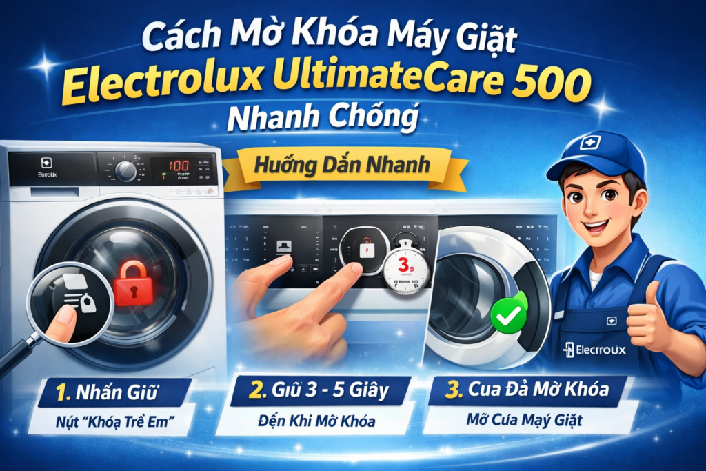 Trong bài viết này, chúng tôi sẽ hướng dẫn bạn cách mở khóa máy giặt Electrolux UltimateCare 500 nhanh chóng, đồng thời giải thích nguyên nhân, dấu hiệu nhận biết, cách phòng tránh và khi nào cần gọi thợ sửa máy giặt Electrolux chuyên nghiệp. Bài viết này chuẩn SEO, tối ưu từ khóa để bạn dễ dàng tìm thấy giải pháp nhanh chóng.